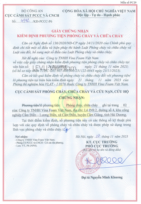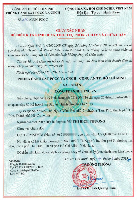 PCCC Việt Nam – Công ty TNHH PCCC.vn tự tin là đơn vị cung cấp các trang thiết bị pccc và bảo hộ lao động chính hãng từ các thương hiệu sản xuất hàng đầu tại Việt Nam như Vinafoam, Dragon Vietlink, Hafico, Yamato, Orion,… đã được kiểm định chất lượng an toàn về PCCC tại Việt Nam. PCCC đã được cấp phép đủ điều kiện hoạt động kinh doanh sản phẩm dịch vụ về phòng cháy chữa cháy tại Việt Nam theo nghị định 136/2020/NĐ-CP. Số giấy phép 110/GXN-PCCC cấp bởi phòng cảnh sát PCCC và CNCH – Công an TP. Hồ Chí Minh.